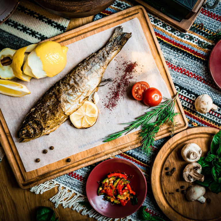 - Makrele mit Zitronensaft beträufeln und grillen oder in der Pfanne 3–4 Minuten pro Seite braten
