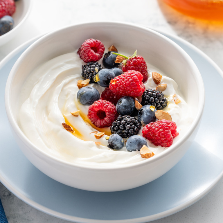 Vormittagssnack: Naturjoghurt mit Beeren und Mandeln